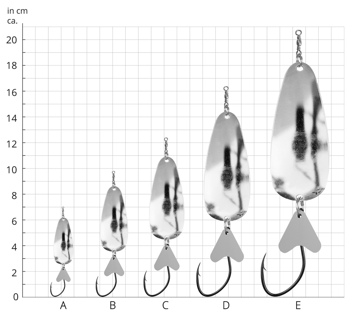 - in der Gr. A (5g - 35mm Länge) gilt er als einer der Urväter aller Forellenspoons in Deutschland, nach weit über 40 Jahren Produktionszeit