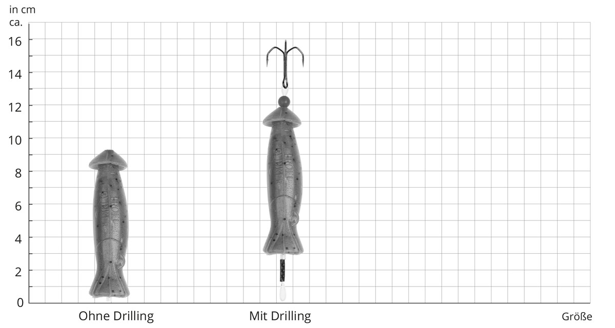 Für die Plopper ohne Drilling empfehlen wir unser Köderfisch- und Gummifischsystem mit Drillingen zum Jiggen. Die Bleiachse wird einfach in das Fischmaul gesteckt und der Drilling seitlich eingehängt. So kann er auch im Tiefen vielseitig gefischt werden. Ein Köder, der beim Anheben der Rute Druckwellen erzeugt
