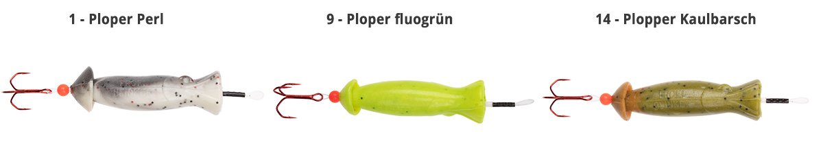 Die ohne und mit Drillingsmontage erhältlichen etwa 7cm langen Plopper werden jeweils in 3 Farben angeboten. Perl-schwarz, Kaulbarsch und Fluo-grün. Fische sehen Fluo-Farben direkt im natürlichen Licht.